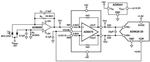 高速光電二極管信號調(diào)理電子線路圖介紹本文聚焦于一款高速光電二極管信號調(diào)理電路,其具備暗電流補償功能,旨在高效轉(zhuǎn)換高速硅 PIN 光電